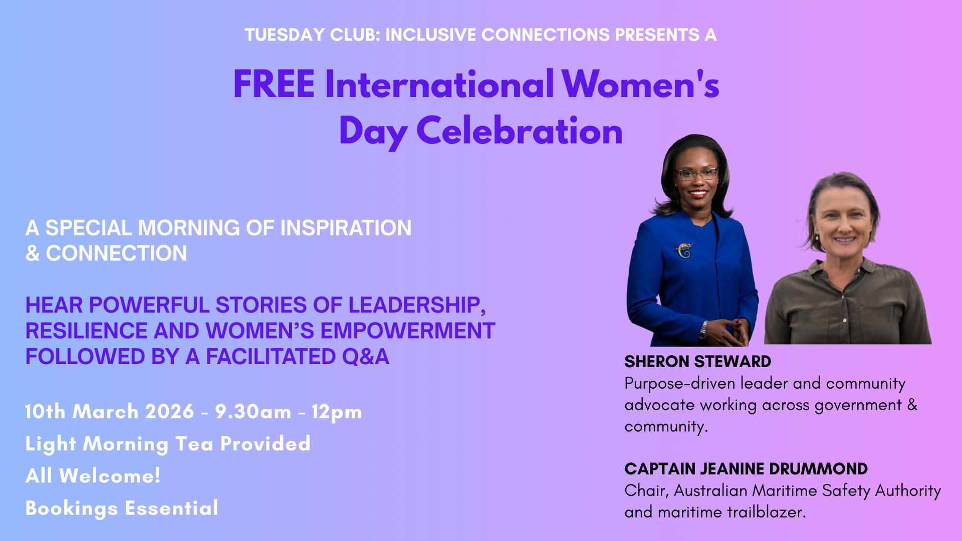 On Tuesday the 10th of March, we invite you to join us for an uplifting morning of inspiration and connection. We are proud to welcome Sheron Steward, a purpose-driven NSW Government leader passionate about empowering women and strengthening communities, and Captain Jeanine Drummond, Chair of the Australian Maritime Safety Authority and a trailblazer in the maritime industry. Hear powerful stories of leadership, resilience and women’s empowerment, followed by a facilitated Q&A.